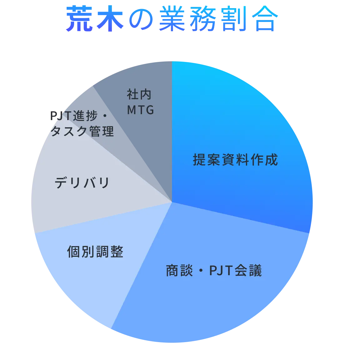 私は朝型なので7時半頃には出社し、1日の作業計画を立てるためのToDo整理を行います。日中は、お客様との打ち合わせや、それに伴って出てきた課題の整理、提案書の作成等を行っています。夕方以降は、お取引先様のフォローアップをメインに行います。施策の結果を分析したり、レポートを作成したりして、1日を終えます。