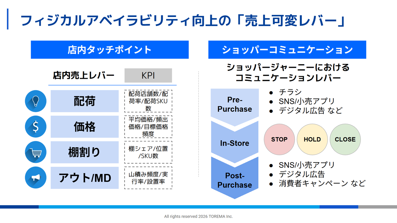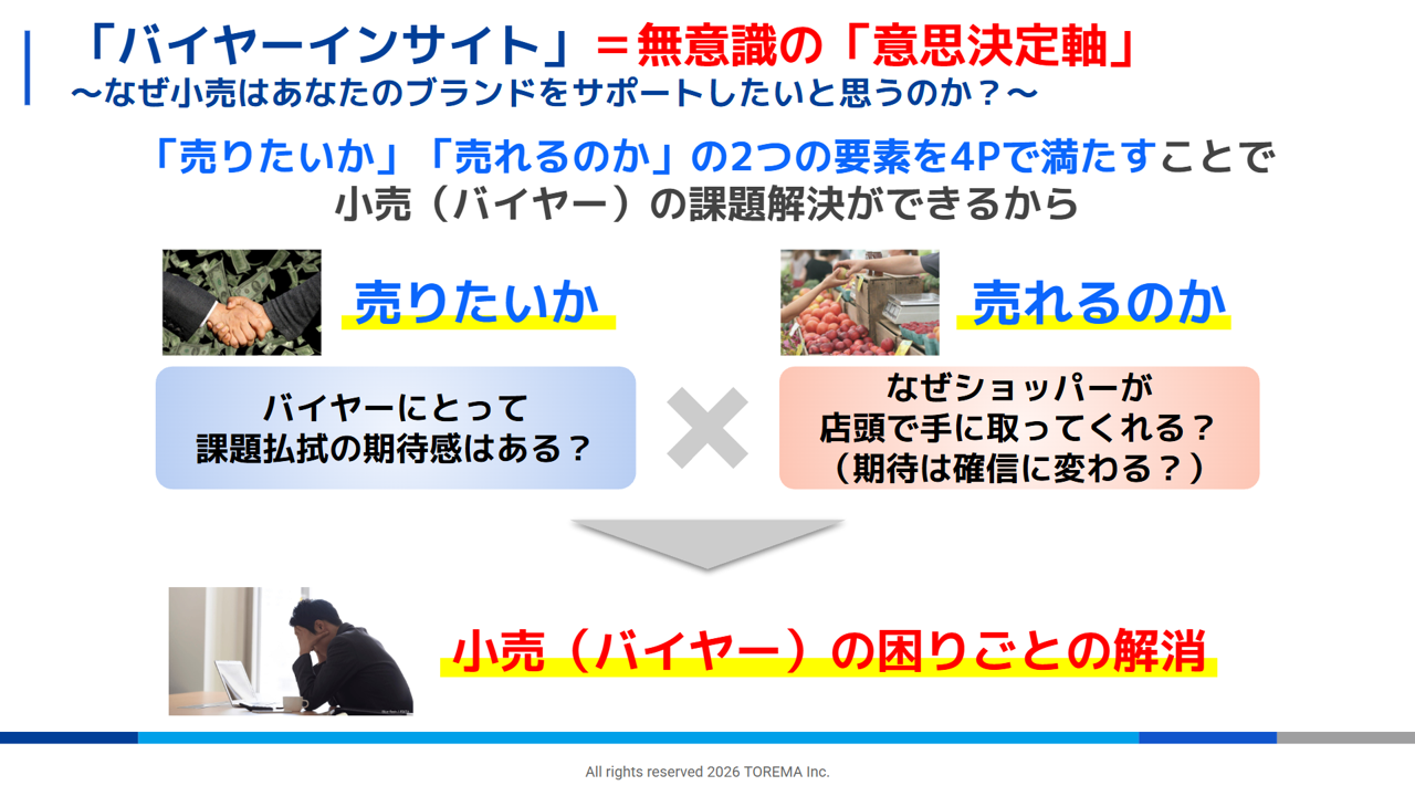 トレードマーケティングが最終的に目指すのは、「店内のタッチポイントの量と質を上げること」と「ショッパーコミュニケーションの量と質を改善すること」の2点に尽きます。そして、その意思決定を担うバイヤーの心理(バイヤーインサイト)を理解することが重要だ、と井本は話します。