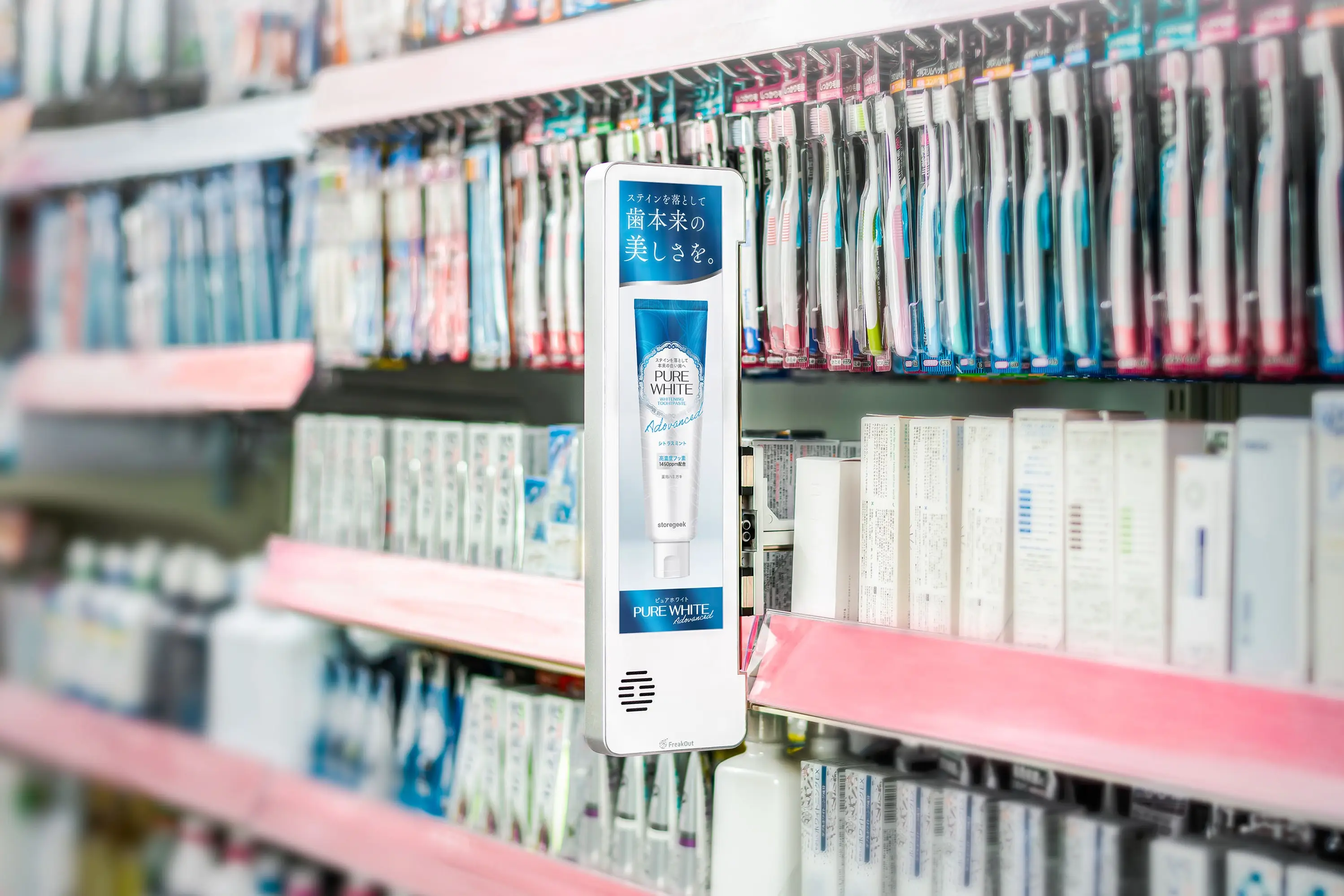例えば、棚の上に置かれているサイネージの場合、遠くから見てそこに何があるというナビゲーション的な役割は一定果たせると思うんですが、それと棚前で行うべきコミュニケーションは異なるものだと思います。サイネージのモニターを棚の上に設置するにしても費用はかかりますし、何かもっと良いアプローチはあるなと感じましたね。