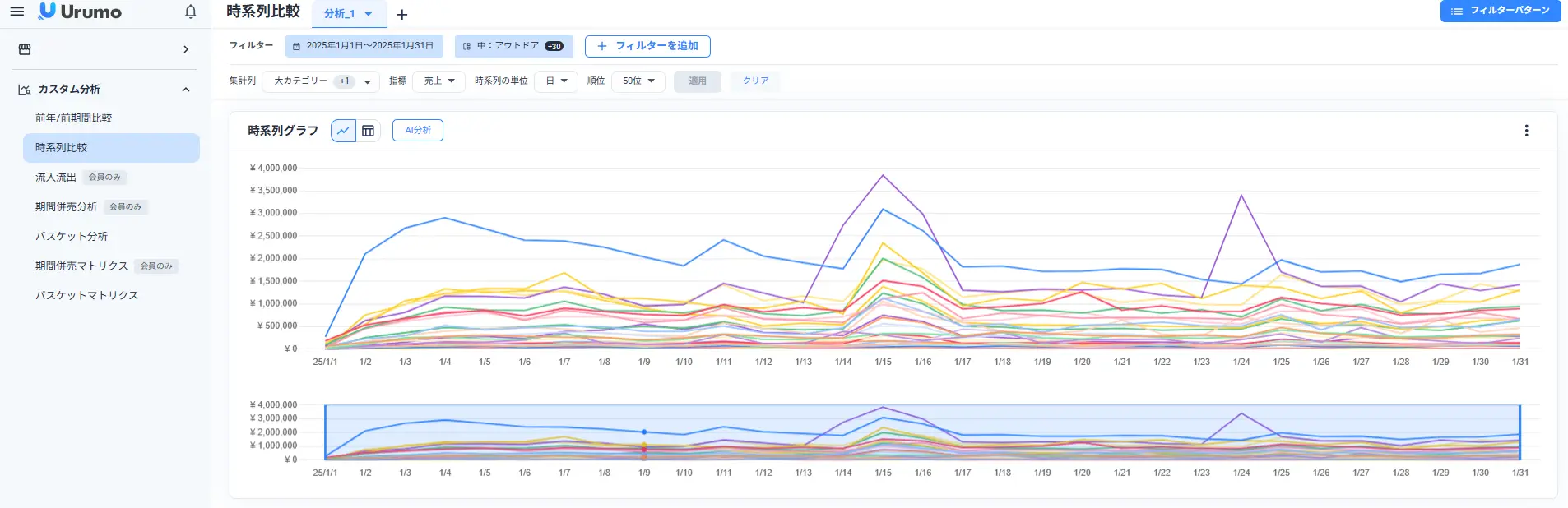 前年比較・時系列比較・性年代別比較などの基本的な分析はもちろん、流入流出分析・併売分析など購買データに特化した分析も少ない操作で高速に分析できます。