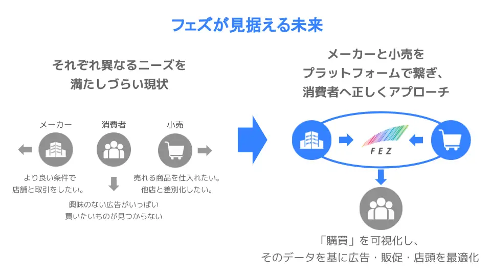 フェズは、広告、販促、店頭すべてをデータで可視化し消費者の目線に立ち考える、「セールスリフト」を軸としたリテイルテック市場を創っていきたいと考えています。そのために小売業界の構造を変革する3つの切り口を実行いたします。