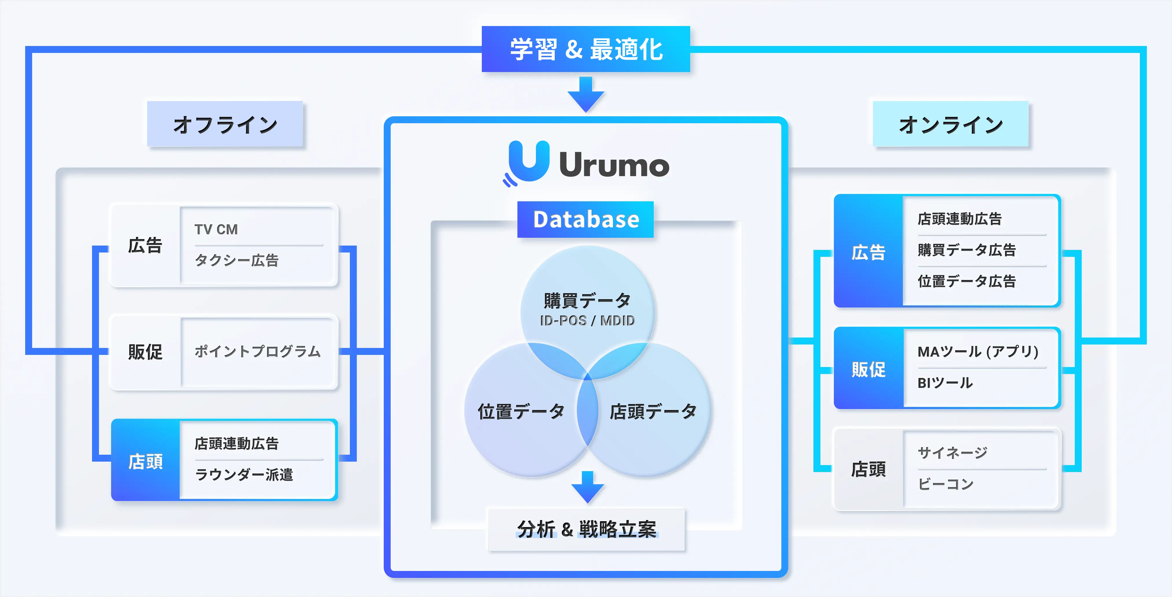 従来の認知やリーチを重視するマスマーケティングの手法に対し、『Urumo OMO』では購買データや位置データ、店頭データに基づき、小売業界に精通した独自の分析ロジックを構築し、戦略および施策を提案します。