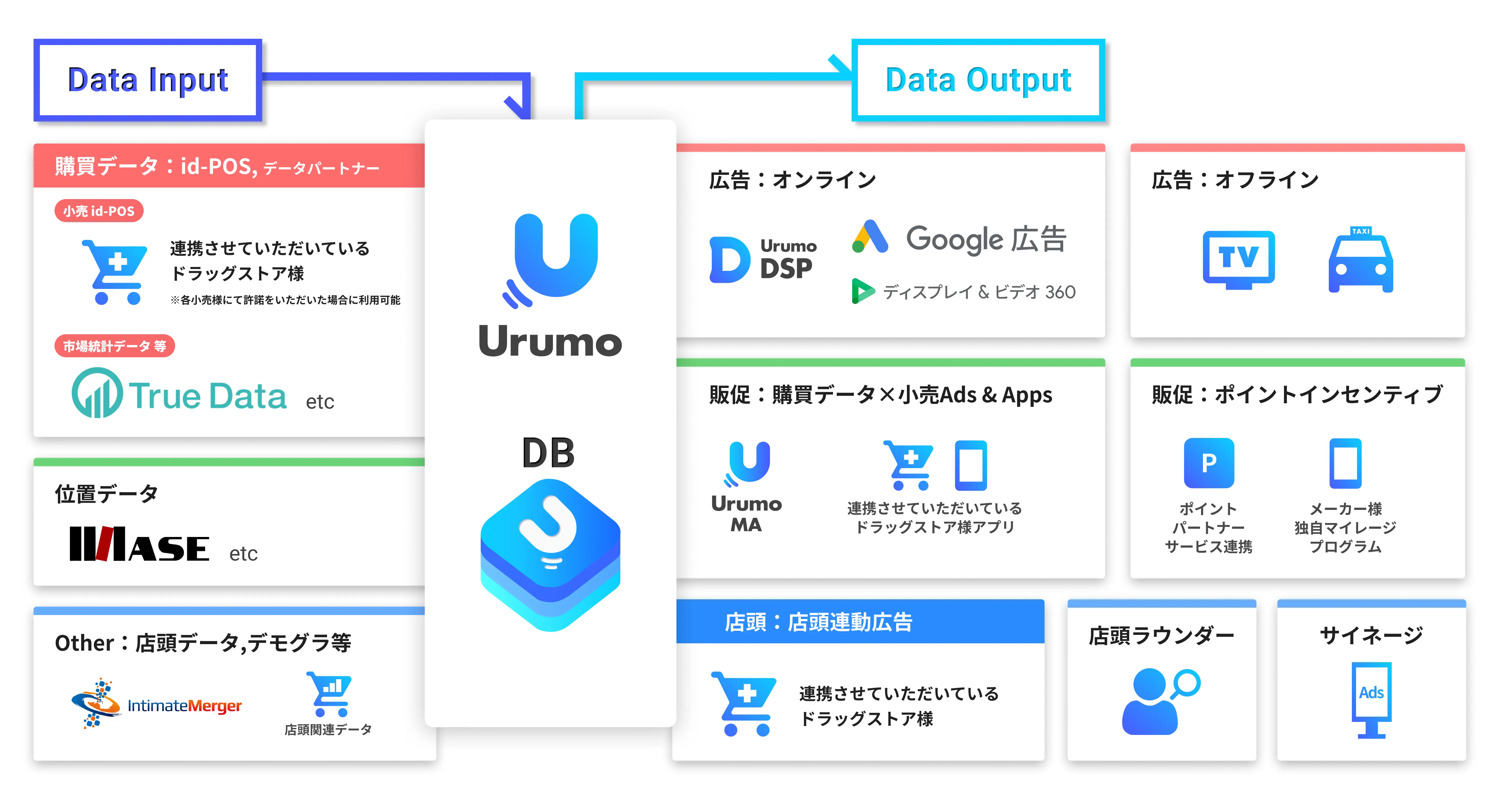 『Urumo OMO』は、実店舗での購買データや位置データ、店頭データを基に分析・戦略立案を行うため、多くの企業様とパートナーシップを組み、かつOMO施策を実現するため、「広告×販促×店頭」各ジャンルの企業様ともパートナーシップを組んでおります。