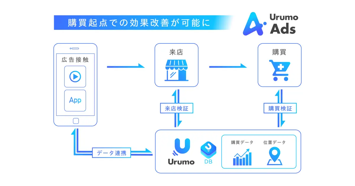 「Urumo Ads」は、このたび主要動画メディアや各種SNS、専門メディア等と連携し、それらメディアへの広告配信が可能になりました。さらに、購買データや位置データと連携することで、最適なターゲティング設計ができ、かつ各メディアでの広告接触者が、オフラインで購買・来店に繋がったかを可視化することが可能となります。このように、「Urumo Ads」では、購買起点で最適なターゲティング設計から、広告配信、さらに広告施策が与える効果の検証と次回施策への改善を継続的に行うことが出来ます。