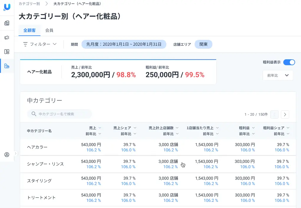 「Urumo Shopper」では、ID-POSを基にしたカテゴリー別・メーカー別・ブランド別の売上・粗利データをはじめとし、購入金額、購入数量、購入者数などへの要素分解や新規購入・リピート購入分析データなどの基本的な分析指標を即座に表示することができます。