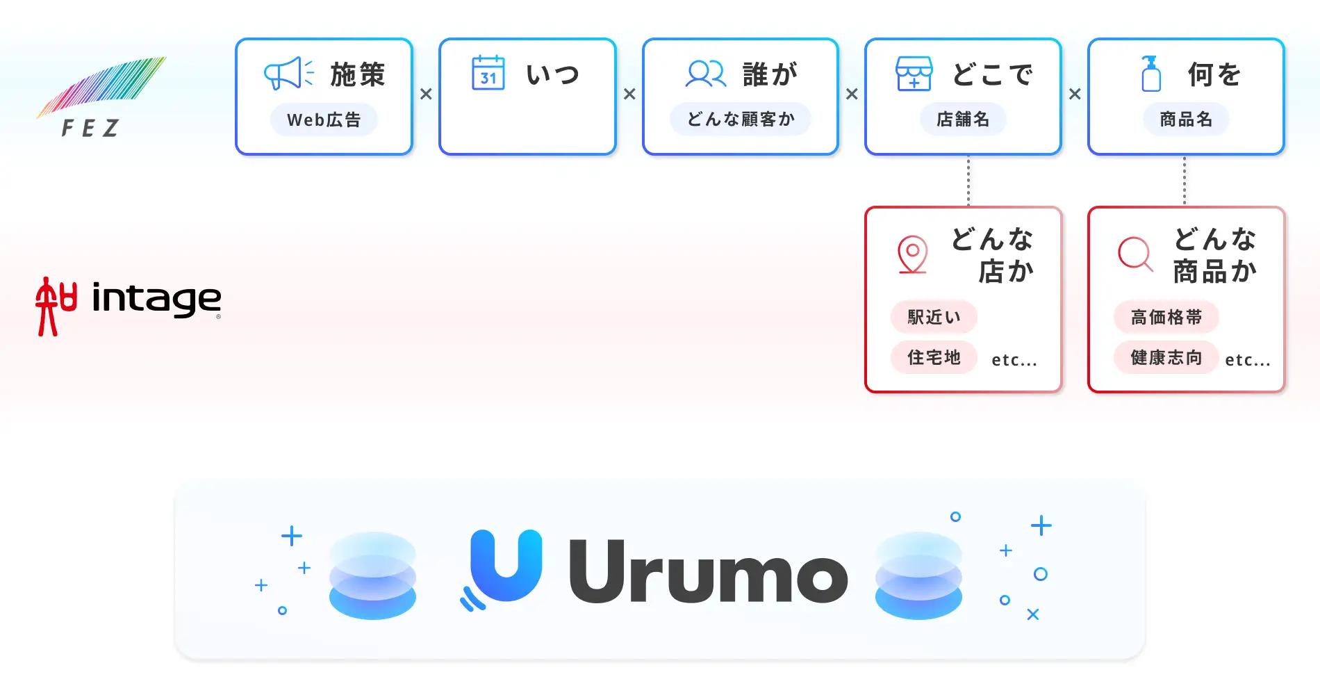 フェズは、複数小売事業者とパートナーシップを組んでおり、2022年3月時点で約9,800万の消費者IDと連携しております。(各小売様より許諾を得た際に利用が可能です。)これにより、広告配信とそれに対する来店検証・購買検証を行う「Urumo Ads」、販売データを元に仕入・販促の最適化をするためのダッシュボード「Urumo Shopper」を展開し、小売事業者・メーカーのマーケティング支援を行っております。