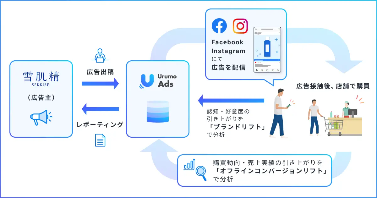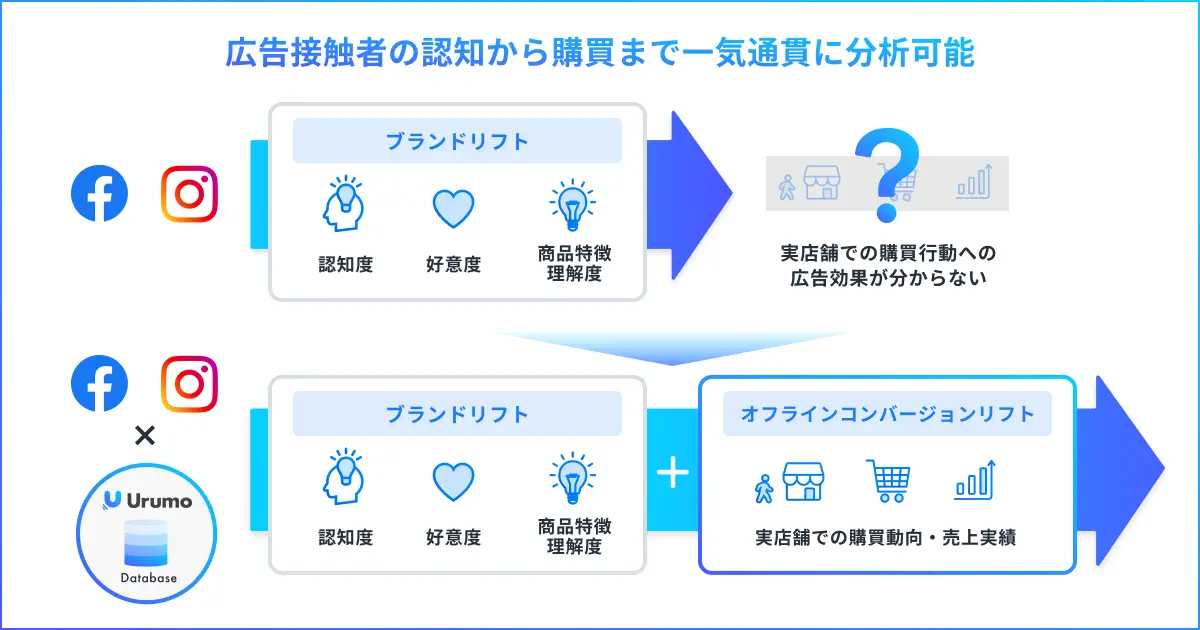 このたび「Urumo」とFacebook、Instagram各メディアがデータ連携し、「ブランド+オフラインコンバージョンリフト」を活用することで広告接触者のブランドリフト値の計測・分析に加え、実店舗での購買動向や売上実績までを一気通貫で計測・分析することが新たに可能となりました。
