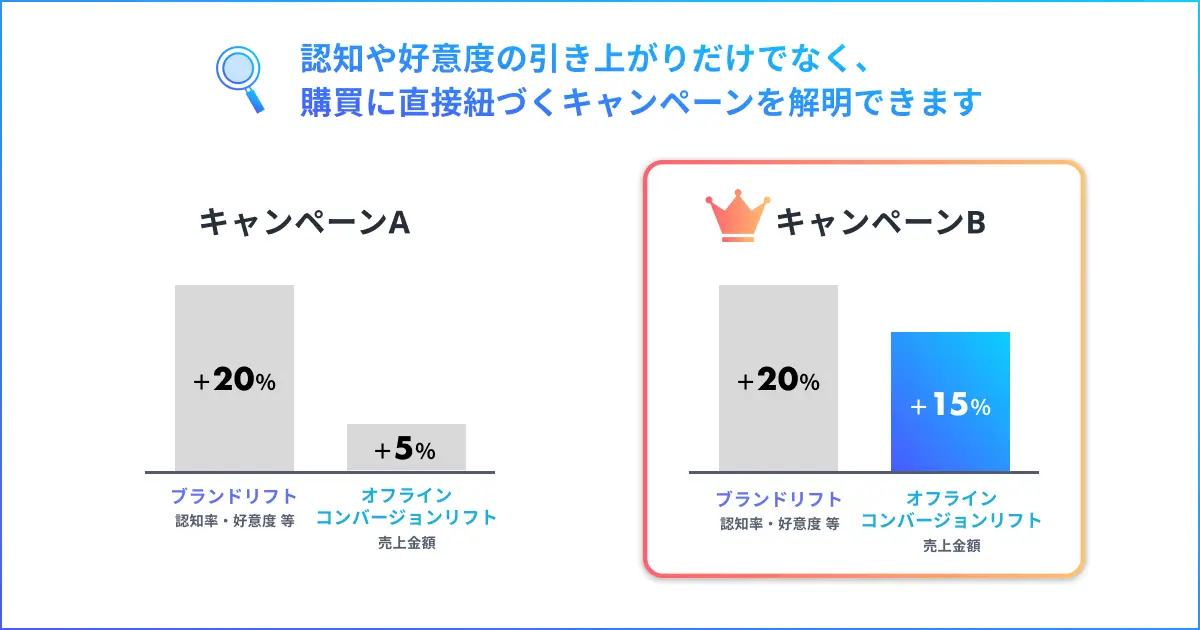 また、ブランドリフト値に加え、オフラインコンバージョンリフト値の計測・分析が可能になったことで、実施したキャンペーンの認知効果と購買効果が相関で把握可能になりました。これにより、継続的にキャンペーンを行い効果計測・分析をすることで、購買可能性が高まる潜在顧客層の想定も可能となります。